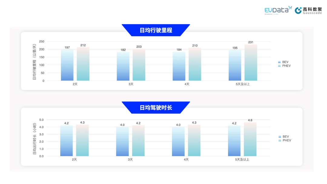 在日均驾驶时长上,BEV与PHEV各组之间也存在差异,但差异略低于其日均出行里程的差异。2天组的组间差距约在2%,5天及以上组的组间差距约在10%。