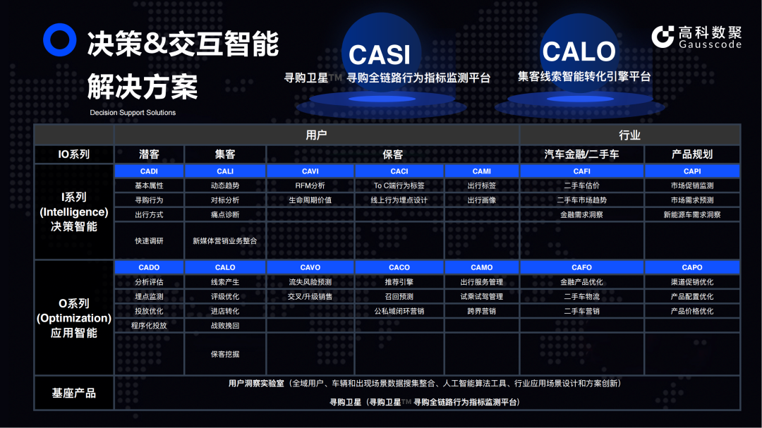 其中,消费者寻购行为监测指数平台(CASI)和线索转化到店智能引擎(CALO)成为决策智能平台、交互智能解决方案平台的典型代表。